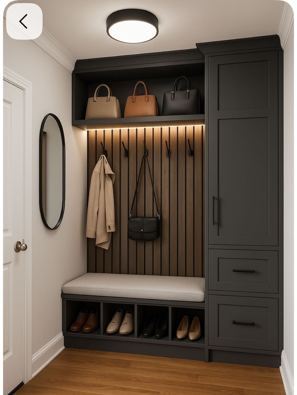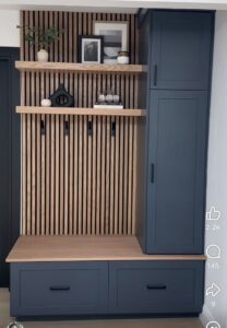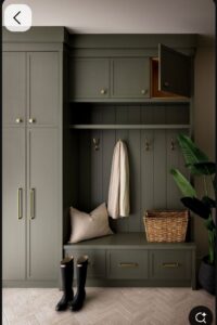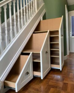 Ideally, we would like some sort of bench with storage for either shoes or bags with some shelves at the top and Coat Hooks. There is an area under the stairs with lots of room. Would like to have either that whole thing cut out, or some sort of shelving or drawers added. You might have some good ideas we’re not thinking of.